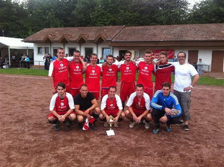 Im Finale am Sonntag, dem 01.07.12 setzte man sich nach einem spannenden Elfmeterschießen mit 11:10 gegen die favorisierte Spielgemeinschaft Holz/Wahlschied. Am Samstag hatte man sich der SG in der Vorrunde noch mit 1:0 geschlagen gegeben müssen. In der 2. Vorrundenpartie wurde durch ein 3:0 gegen die Sportfreunde aus Obersalbach das Halbfinale am Sonntag dennoch erreicht. Hier kam es zur Begegnung mit der 2. Mannschaft der SG Holz/Wahlschied, die sich am Vortag gegen die Gastgeber aus Eiweiler und die Mannschaft vom VFB Heusweiler durchsetzen konnte. Diese Partie gewann unsere Mannschaft mit 2:0. Da die SG Holz/ Wahlschied 1 ihr Halbfinale gegen den Gastgeber aus Eiweiler mit 1:0 gewann, kam es im Finale zur Neuauflage der Vorrundenpartie. Nach einer taktisch klugen Partie, in der man der SG kaum Torchancen ermöglichte und selbst kurz vor Ende der regulieren Spielzeit noch eine Möglichkeit hatte die Partie für sich zu entscheiden, kam es zum Elfmeterschießen. Obwohl die Beine bei allen Schützen nach 200 Minuten Spielzeit innerhalb von 2 Tage schwer waren, verwandelten die ersten 10 Schützen beider Teams sicher. Beim Stand von 10:10 lief als 11. Schütze für den FCK Steven Schmidt an und auch hier war der Keeper der SG machtlos. Da im Gegenzug Achim Rieber von der SG Holz/Wahlschied das Tor knapp verfehlte, war die Überraschung perfekt.
